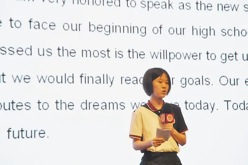 Pre年级的伊依同学代表新生发言。伊依同学怀着去英国读大学的梦想来到光剑。在演讲中,和大家分享了她对学习的认识。