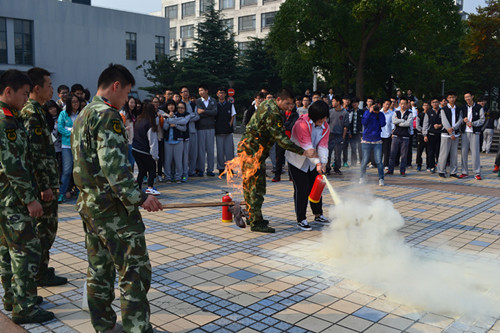 随后火警铃声响起,同学们则在老师们的指挥下有序的来到空旷的“安全区域”,在那里申江消防中队的官兵还为同学进行了灭火器安全使用的实际演示。在消防官兵的讲解演示之后,一些同学也在他们的指导下进行了实际操作。