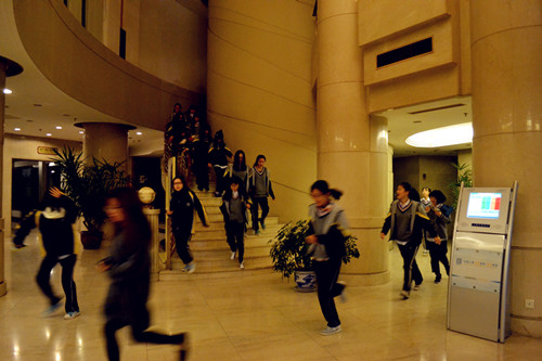 与光华浦东安排的演习时间有所不同,光华复旦将消防安全演练放在了12日晚间9点。晚自习后,当同学们陆续回到寝室没多久,急促的警示声响起,分住两栋楼的同学在老师们的指挥下以最快的速度、安全有序的来到指定安全区,五分钟的时间,百分之九十的学生都已到位,寝室长点名、汇报集合情况……