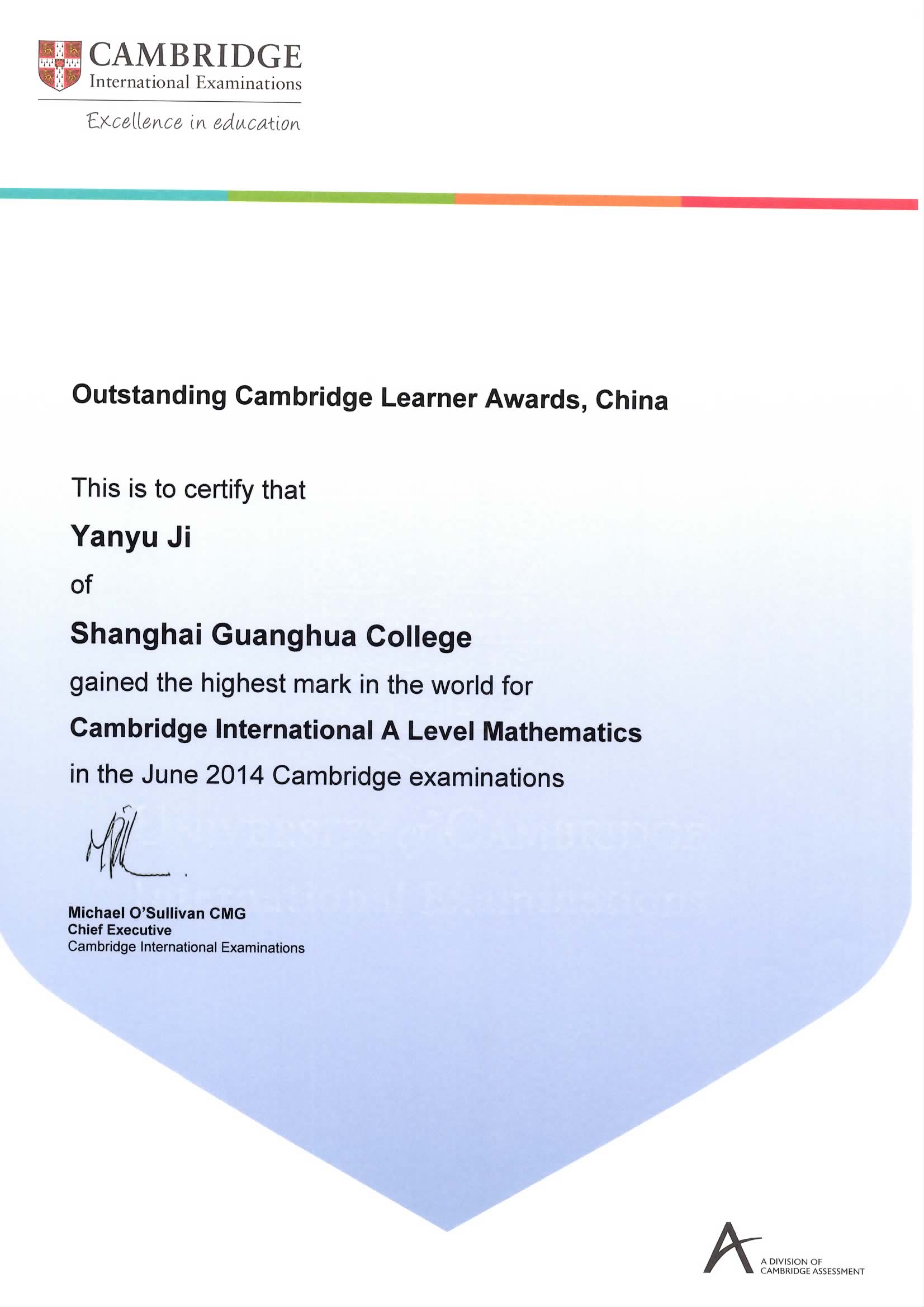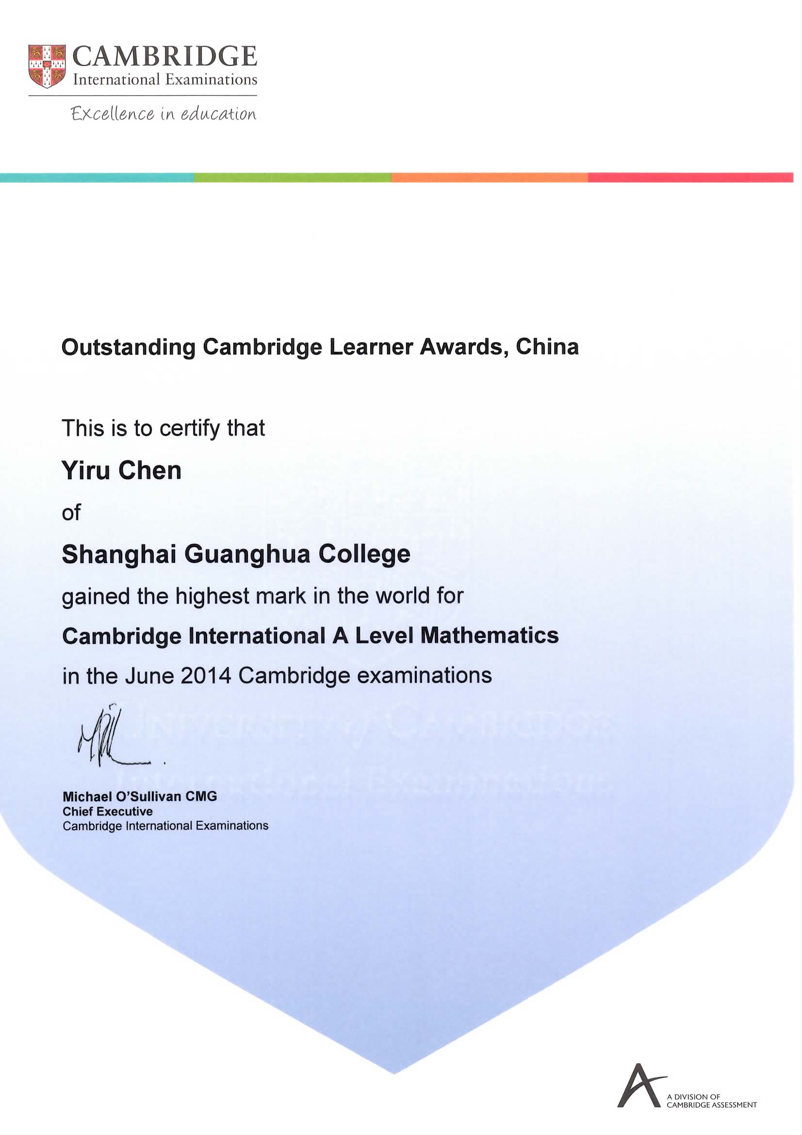 陈怡如同学在2014年6月CIE A level 数学考试中获得全球最高分的好成绩