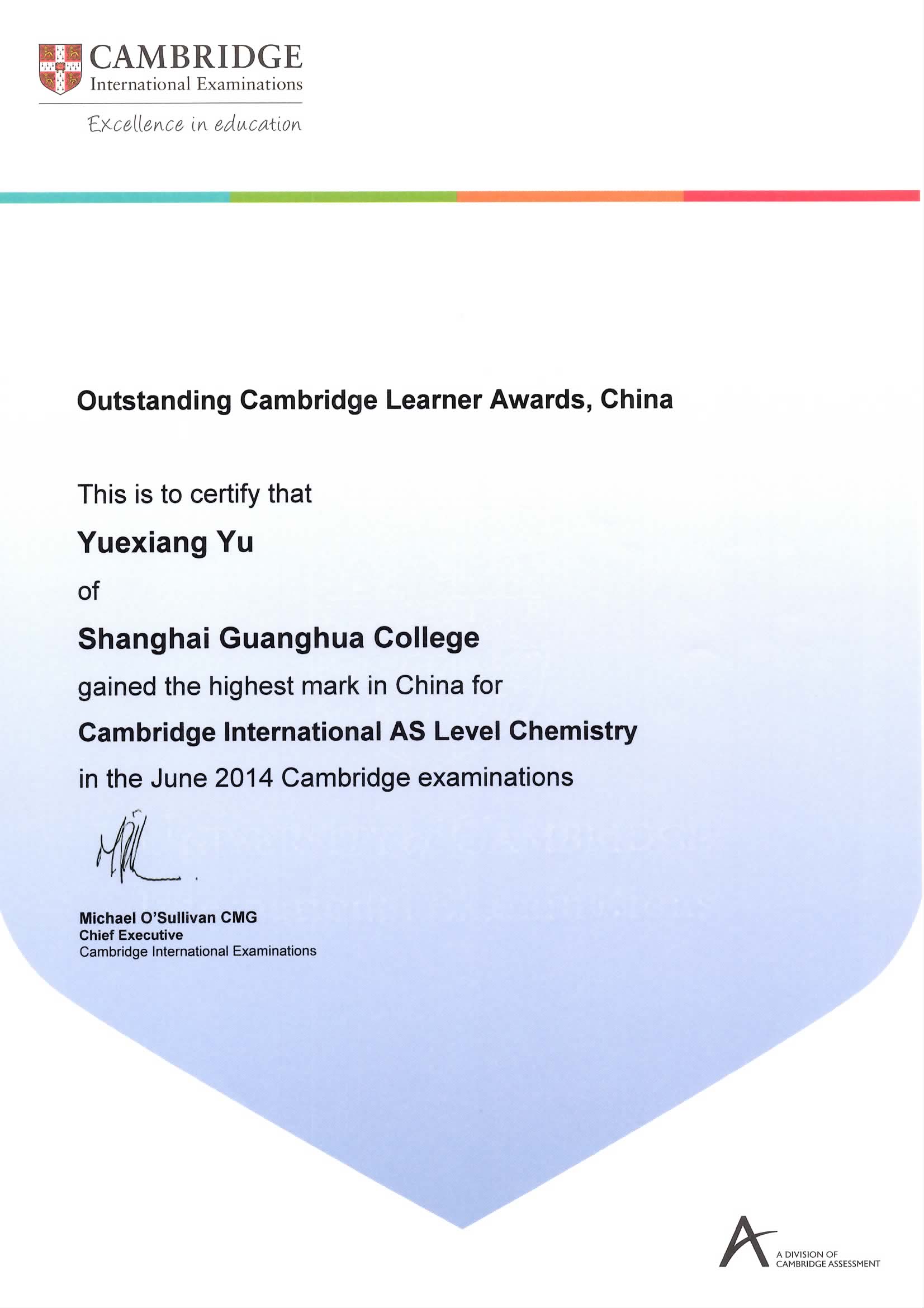余越祥同学在2014年6月CIE AS level化学考试中获得中国区最高分的好成绩