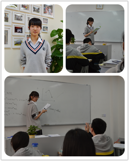 2014年3月25日(周二)在等待我们采访的间隙,她正在翻阅一摞教材,原来,当天下午四点一刻她作为志愿者要给低年级需要帮助的同学补习化学课。我们后来见识了她补课的情景:站在讲台,很随意,很自如,边念题边板书,下面的同学则边听边记,还真像一回事。采访中问到补课这件事,陶然说,自己从小就喜欢当老师,看到经过辅导的同学作业的正确率越来越高,“还蛮有成就感的”。
