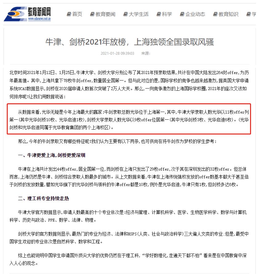 2021年牛津剑桥放榜季,光华教育集团拿下了上海78枚牛剑offer中的20枚,霸榜上海国际学校,媒体教育新闻网进行了报道推介。