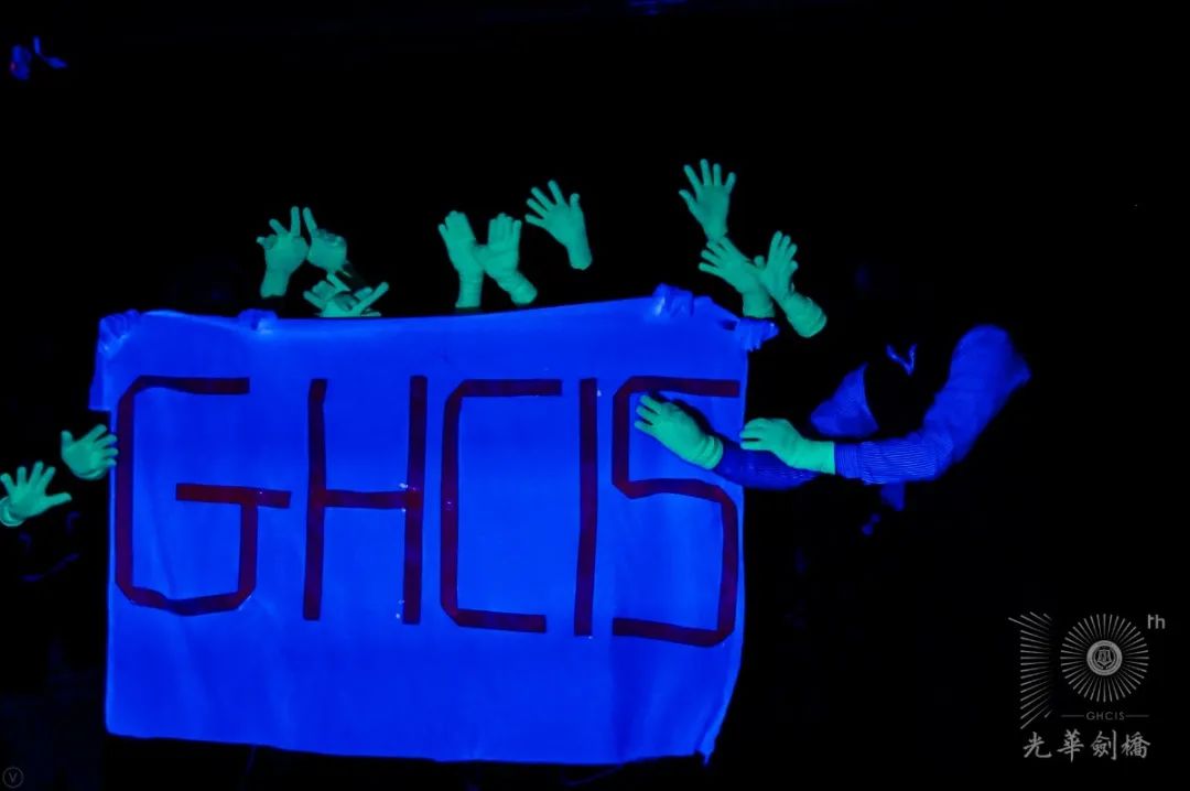经济组带来的荧光舞颇有新意,当全场灯光熄灭,他们戴着的荧光手套便如同夜空中明亮的星。除了用手组合摆出了“树”、“牛”、“千手观音”等造型,他们还准备了“GHCIS”的手幅,用一个个闪闪发光的点赞手势,表达了对光剑的爱意。
