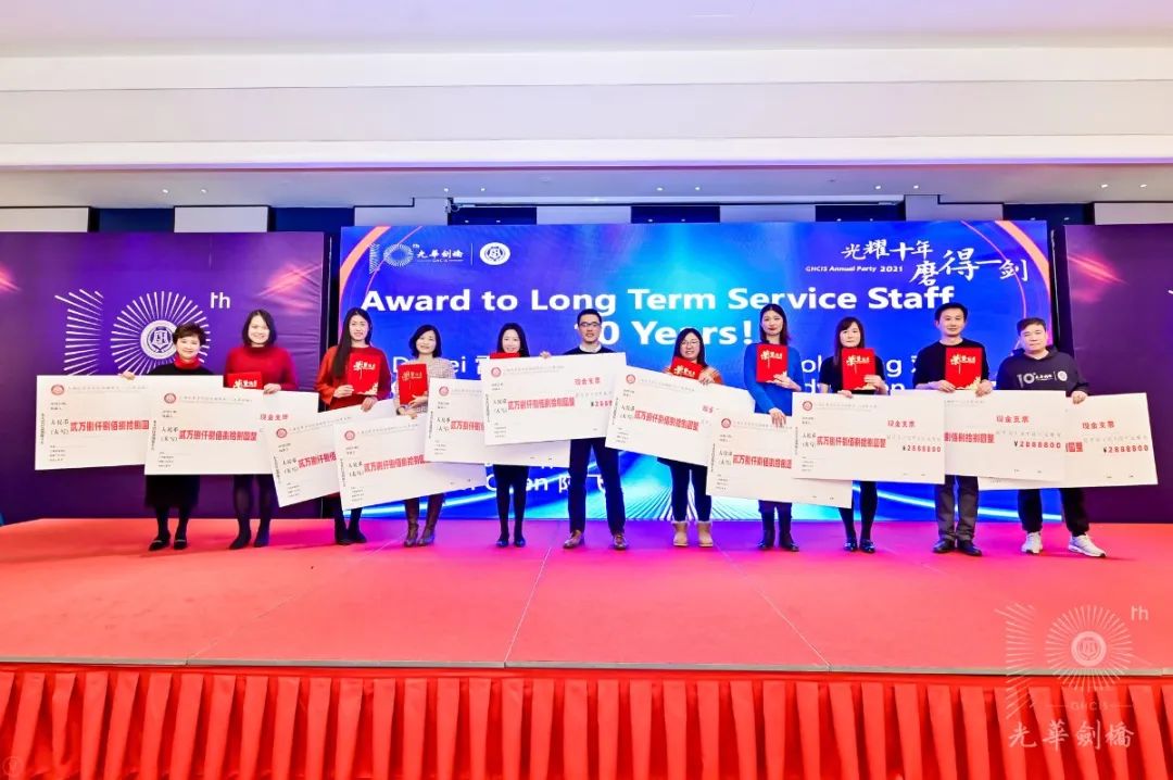 在每年的年会上,都会给与光剑同行五年的同事们颁奖。今年是光华剑桥十周年的生日,也是参与光剑建校的同事们入职十周年。当大屏幕上放出光剑创始团队的照片时,校长雷博感慨万千。她说,光华剑桥是在我们这群有点理想,有共同追求的人的共同努力下,一步步走到今天。很多人从小伙子、小姑娘变成了妈妈、爸爸,不少老师也走向了管理岗位。这些年我们一起互相成就,期待我们一起走到下一个十年!